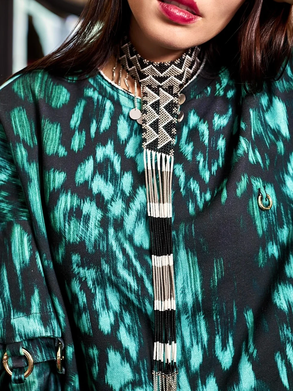 Components: maasai beads, natural leather, metal pendants.